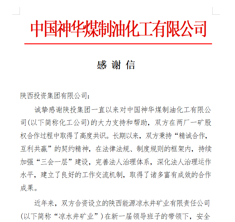 “誠(chéng)摯感謝陜投集團(tuán)一直以來(lái)對(duì)中國(guó)神華煤制油化工有限公司的大力支持和幫助……作為股東方,我們對(duì)涼水井礦業(yè)領(lǐng)導(dǎo)班子和廣大干部職工所做的突出貢獻(xiàn)予以充分肯定和高度贊賞,并向大家表示衷心的感謝!”近日,中國(guó)神華煤制油化工有限公司向集團(tuán)公司發(fā)來(lái)感謝信,對(duì)與集團(tuán)在兩廠一礦股方面的良好合作,對(duì)陜西能源權(quán)屬?zèng)鏊V業(yè)公司生產(chǎn)經(jīng)營(yíng)的突出成果表達(dá)誠(chéng)摯感謝。