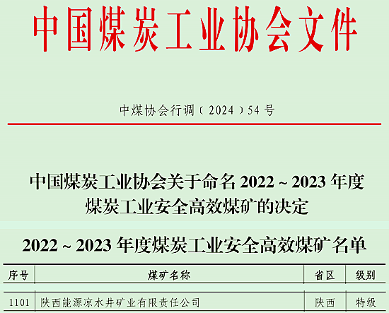 近日,中國煤炭工業(yè)協(xié)會公布“2022—2023年度全國煤炭工業(yè)安全高效煤礦”評審結(jié)果,涼水井礦業(yè)公司名列其中,且等級為特級。